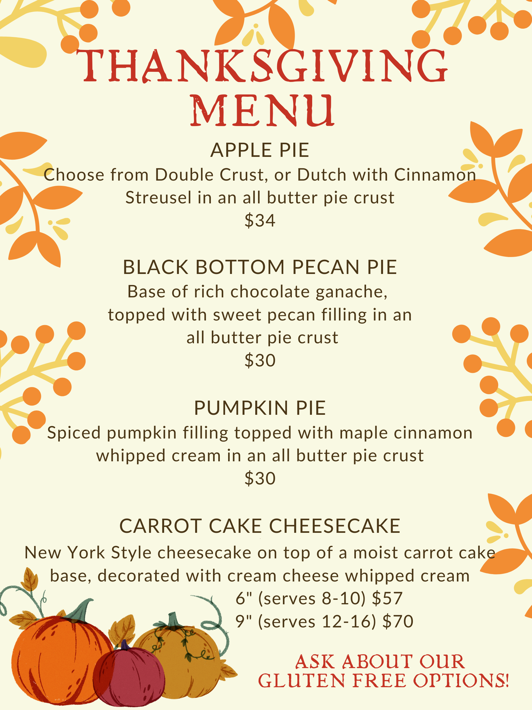 Our Thanksgiving Menu is now available for pre-order until 11/22 for pickup on 11/26! Impress your loved ones with Thanksgiving Dessert from GSP!
